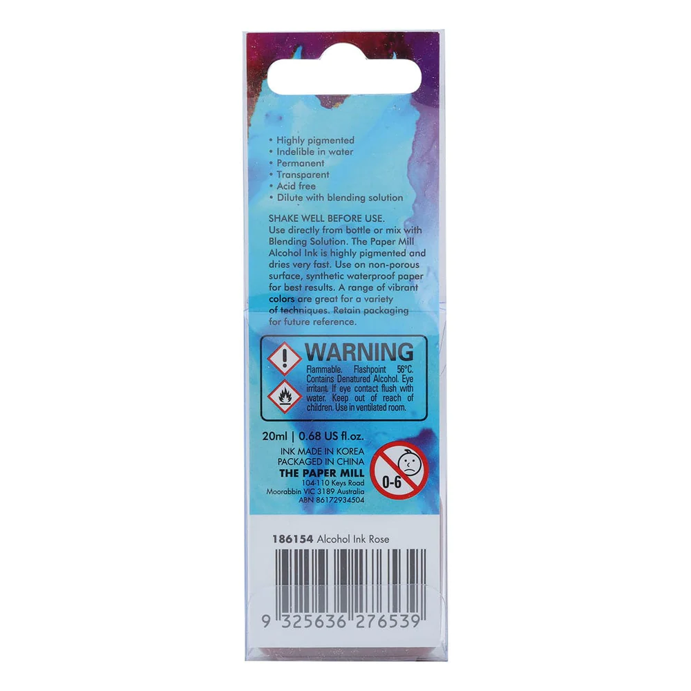 The Paper Mill Alcohol Inks are bright, vibrant pigments that dry fast and can be used on almost any non-porous surface. Every colour is permanent, acid free and transparent, and they all mix well together when combined with The Paper Mill Blending Solution. The Rose ink is a rich, beautiful pink that will add warmth to paintings and delight viewers. When used with blending solution it lightens to a delicate blush hue that will compliment many other colours in this range.